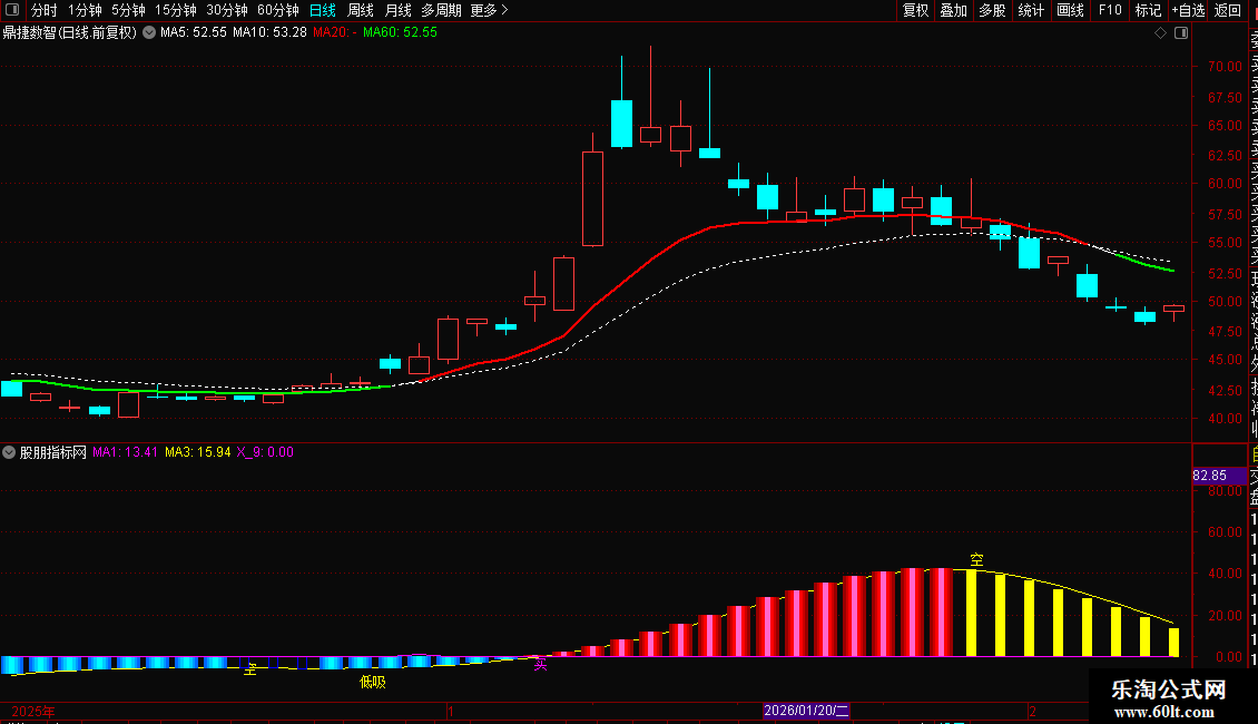副图通过“主力动向”与MA1/MA3交叉信号,识别主力动向及“低吸”“买”时机,搭配RSI超买预警。