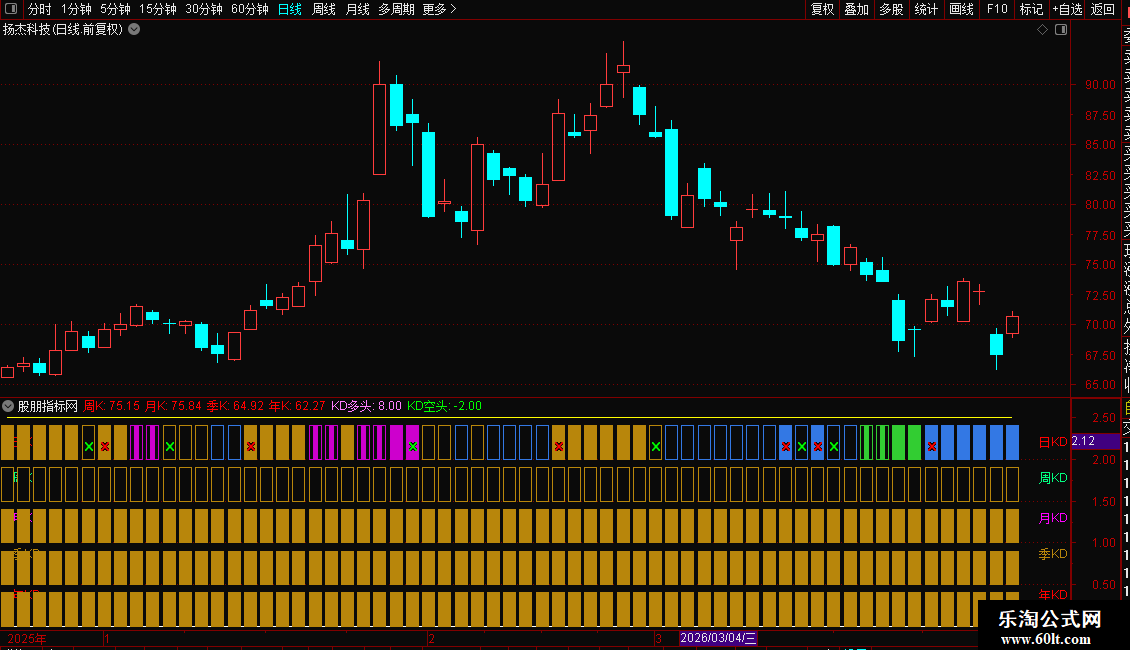 是一款实用的副图指标,专门用于多周期KDJ指标的同图展示。该指标不含未来函数,其独特之处在于能够将日、周、月、季等多个周期的KDJ指标整合在同一副图窗口中,大幅提升看盘效率,帮助投资者更直观地把握多周期共振买点,捕捉潜在强势股。需要留意的是,由于该指标使用了引用函数,目前仅支持电脑版通达信等软件使用,手机版无法安装。