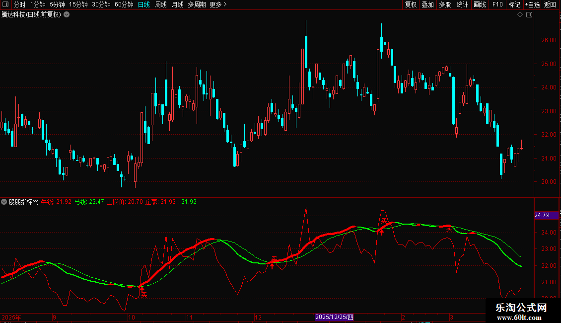 3. 交易信号:当牛线上穿马线时,在图表上标记“买”字和图标,提示买入机会。