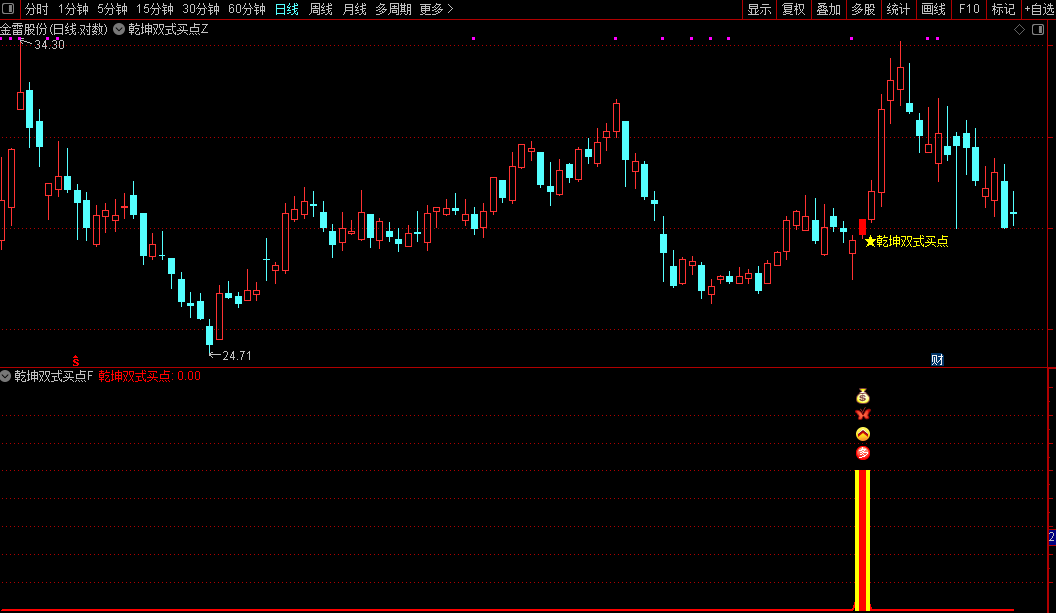 乾坤双式买点指标由1个主图、1个副图与1个选股指标构成,基于超跌反弹与强势回调的量化逻辑构建,不含未来函数,适配手机及电脑端通达信软件,信号仅供辅助参考。