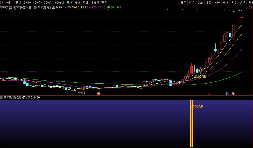 2、当公式中出现“枭龙起爆”信号,就是龙头股启动的信号,可结合日线金叉做出买入决定;