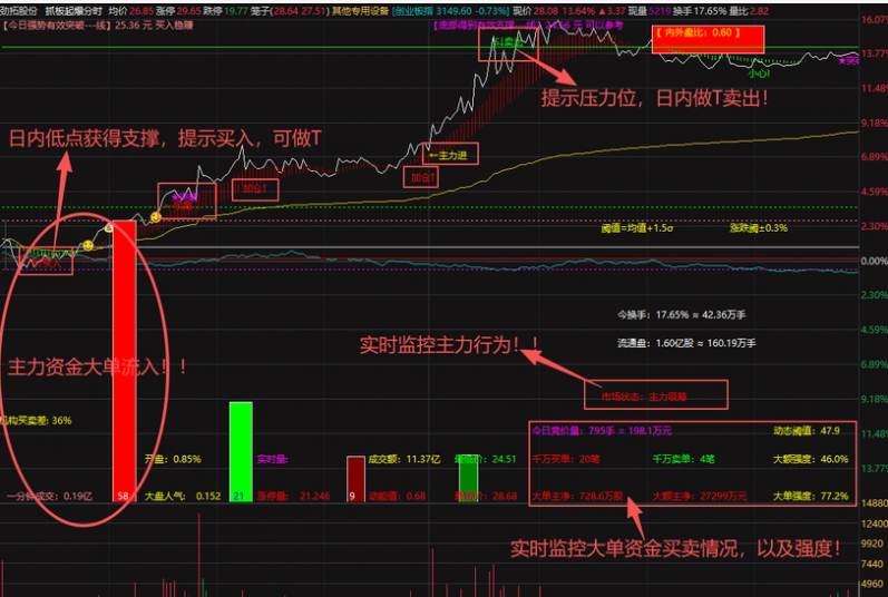 超全面的分时主力资金监控 + 买卖点提示 + 市场状态判断复合型公式,整合了资金流向、量价分析、主力行为、阻力支撑、竞价数据、动态阈值六大核心逻辑,是实战型分时看盘公式。