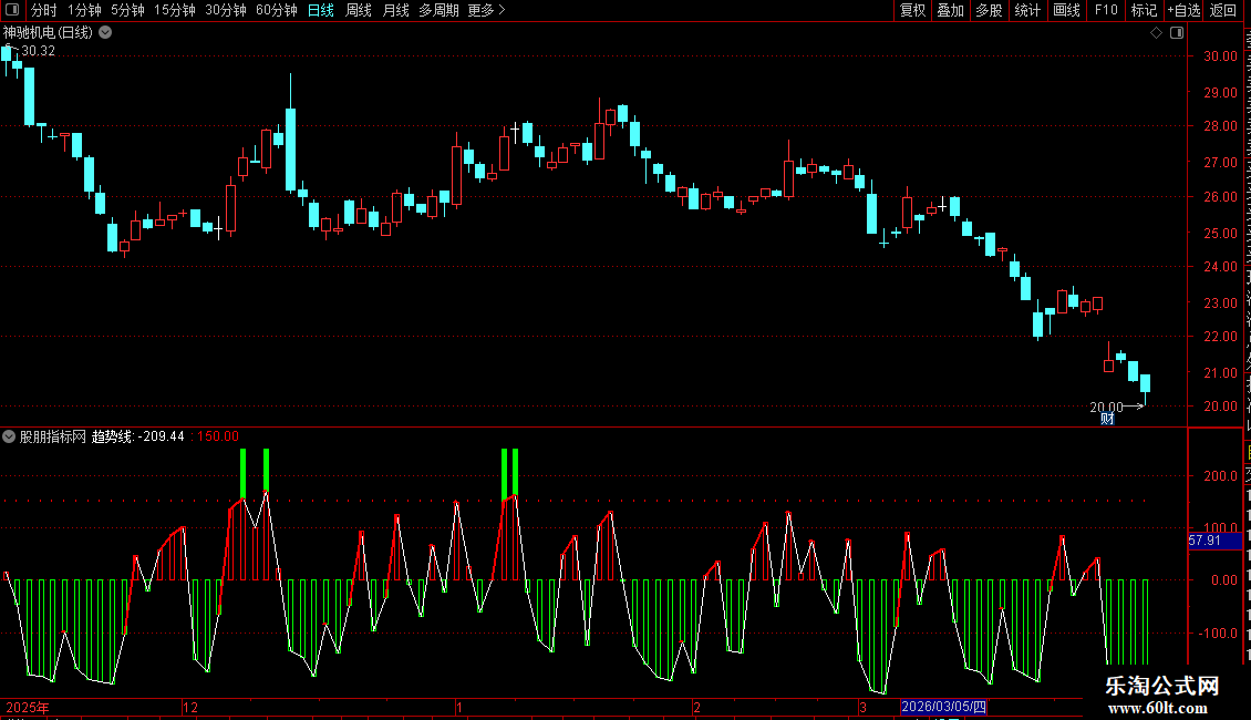 风险警示信号:当“趋势线”数值大幅攀升并超过150参考线,特别是触发顶部绿色警示区域时,需警惕股价可能过热,存在回调风险。