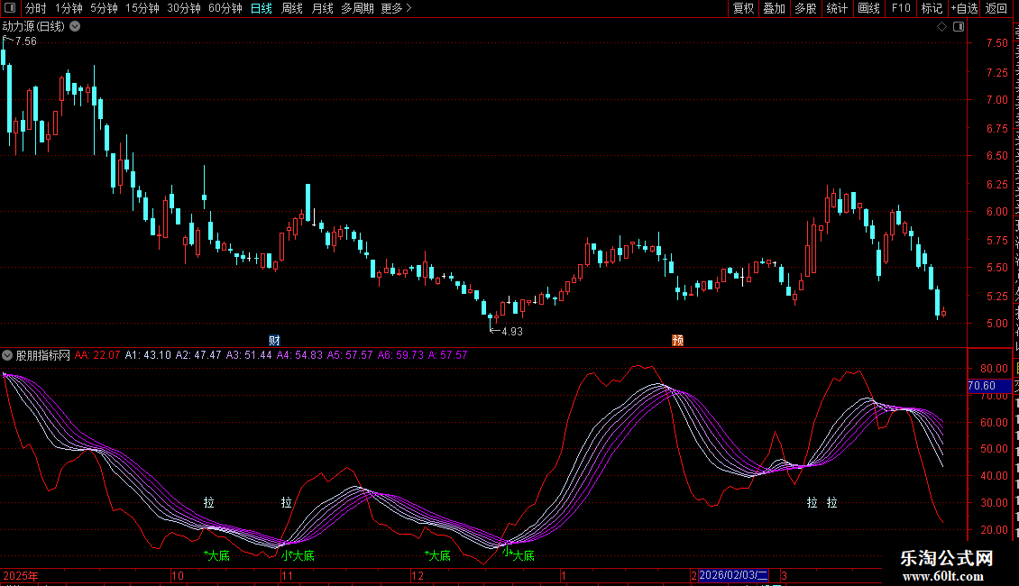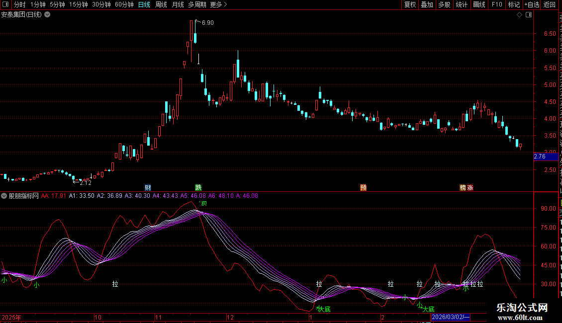 趋势跟踪与强势信号: 通过观察主趋势线(aa)与多层慢速线(A1-A6)的排列、交叉关系来判断趋势方向。在特定条件(如价格单日涨幅大、趋势线金叉且处于中低位)满足时,标记“拉”,提示可能出现强势上涨。