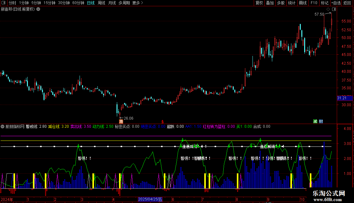 1. 动力线与风控:通过“动力线”上穿三条预设的警戒线(警戒线、减仓线、卖出线),发出明确的文字和图标警示信号,提示警惕、减仓或出局。