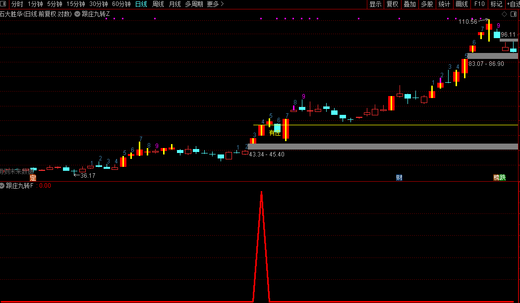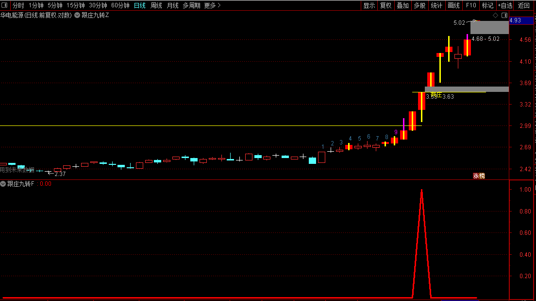 更值得一提的是“有庄”提示和数字“9”的转点信号。当股价在特定结构下连续上涨,第九天往往成为变盘窗口,主图上会直接标注出来。再配合副图的RS强弱指标和吸筹区域判断,何时该持有、何时该警惕,一目了然。