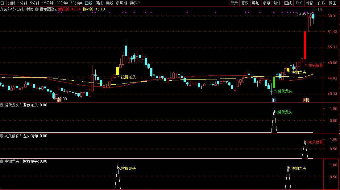 “挖掘龙头”(黄色信号)适用于短线突破操作,
