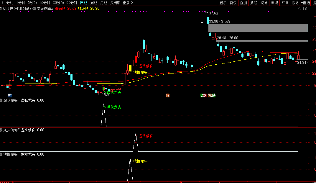 构建“挖掘龙头”“龙头信仰”“潜伏龙头”三级信号体系,基于价格交叉、成交量放大(换手率>5%)及均线排列状态,分层级提示买入时机。