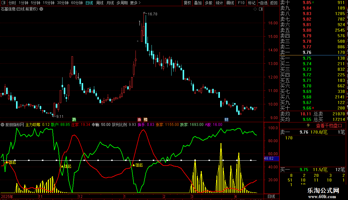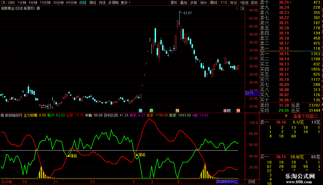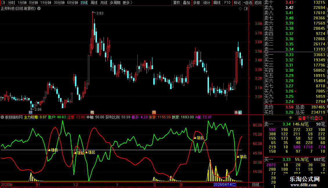使用方法:副图指标需叠加至K线图,观察“主力吸筹”黄色柱状与“庄家线”红色趋势,配合“雄起”信号捕捉强势机会;公式用于每日复盘筛选符合条件的个股,需结合成交量、换手率等辅助验证。本指标融合“主力吸筹”“庄家动向”“散户行为”等多维度数据,适合中短线波段操作,需注意结合市场环境与个股基本面综合判断。