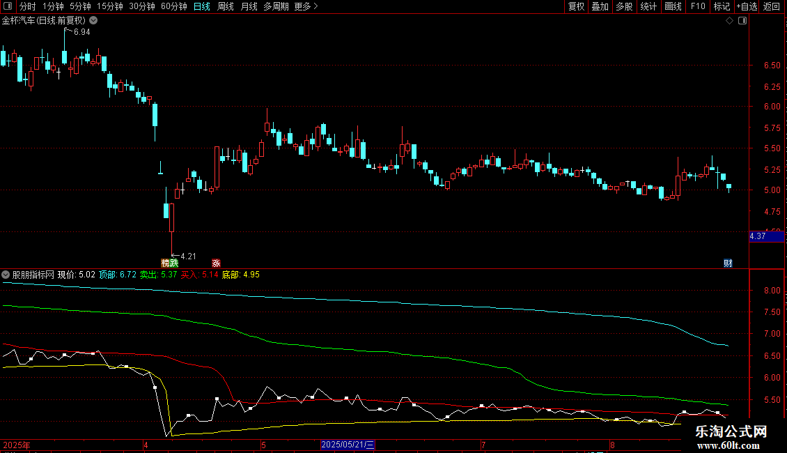 1. 以现价为基准,在副图绘制四条水平线,分别代表“顶部”、“卖出”、“买入”和“底部”四个关键成本价位。