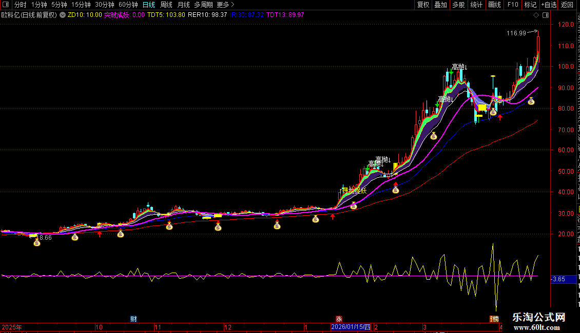 6. 止盈信号:K线上方出现白色“高抛↓”,代表指标进入超买区间,需及时止盈离场。