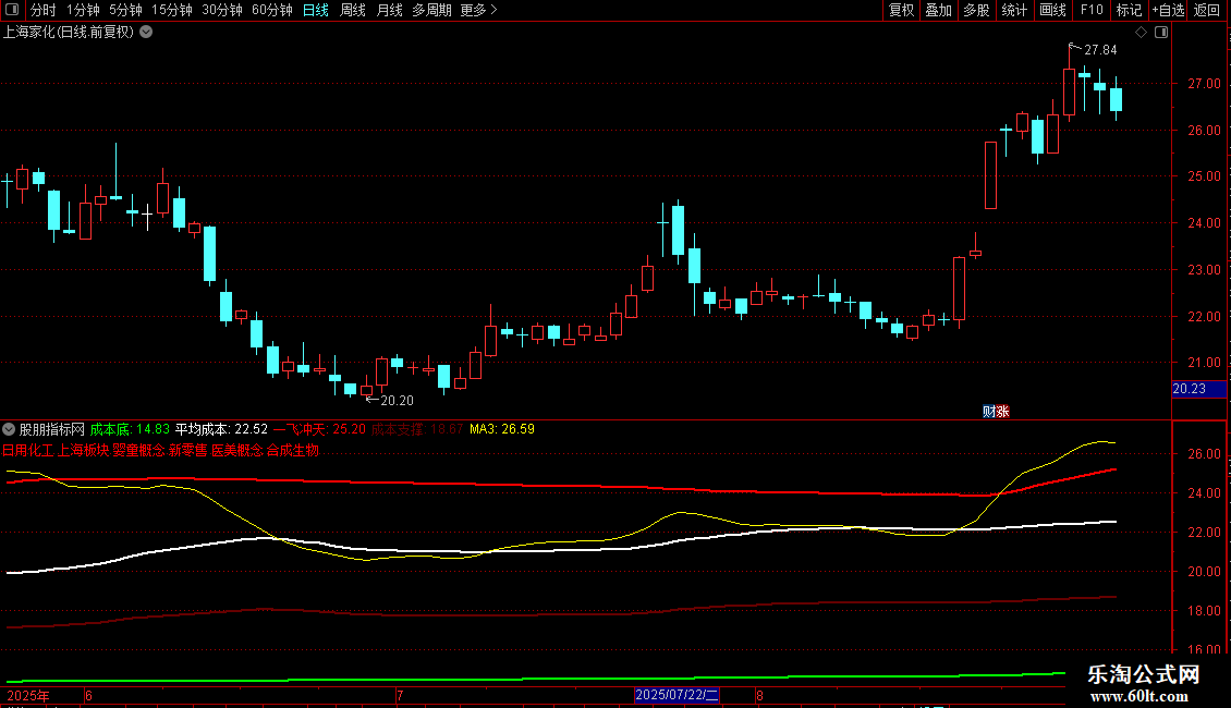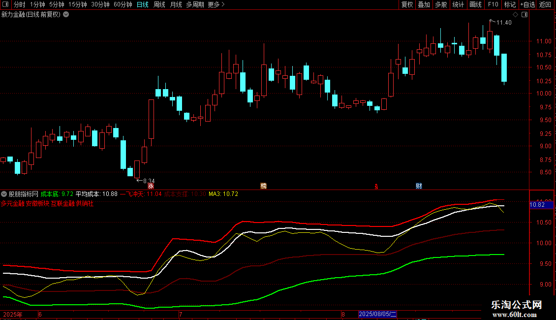 2. 成本线指标:基于筹码分布计算三条成本均线(成本底、平均成本、一飞冲天),并绘制一条成本支撑线(成本底与平均成本的均值)。另有一条黄色EMA线(MA3),用于辅助分析。