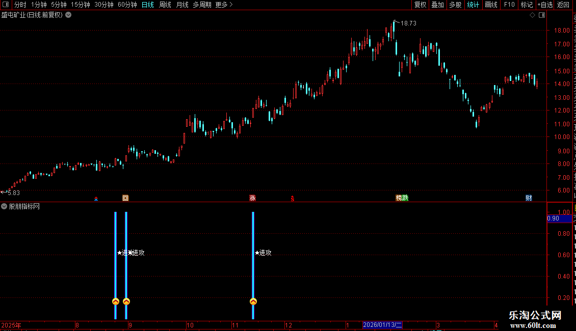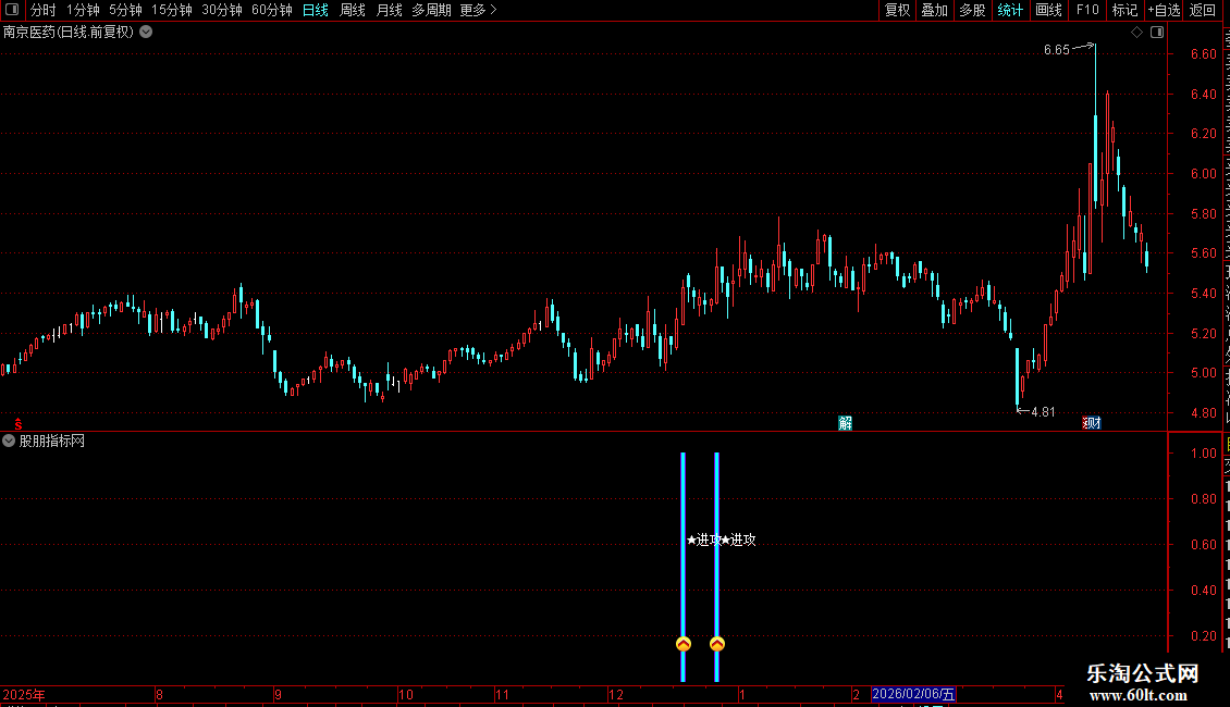1. 副图指标:安装后副图出现粉色柱状+进攻图标+文字信号,即为标准买入提示,代表个股完成洗盘、放量突破20日压力位,趋势反转。