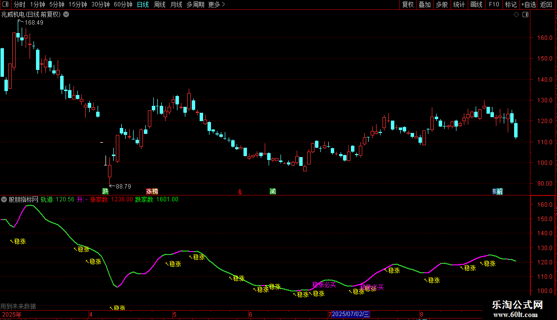 指标包含三条轨道线(红轨道、轨道、升),用于判断趋势方向。起爆信号基于MACD差值变化,当差值加速上穿15时提示“稳涨”。稳涨必买信号结合30日RSI快速上升(>9)和放量条件(>2.4倍或连续缩量后放量)。副图还显示涨跌家数及涨停标记。选股预警可直接用于条件选股或盘中预警。