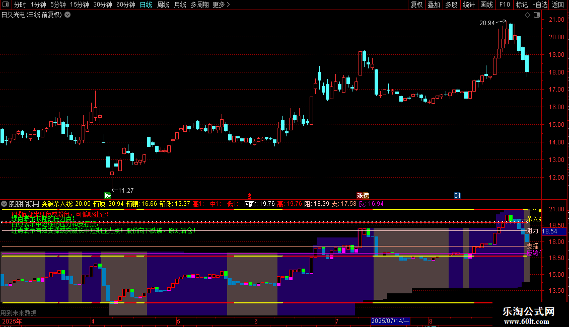 使用方法:将代码复制到公式编辑器,选择“副图”或“主图叠加”类型,应用于K线图即可显示。支撑线、进场线、移动止损线、轨道、ZIG图标和“暴涨”文字会自动生成,用于辅助判断买卖点。