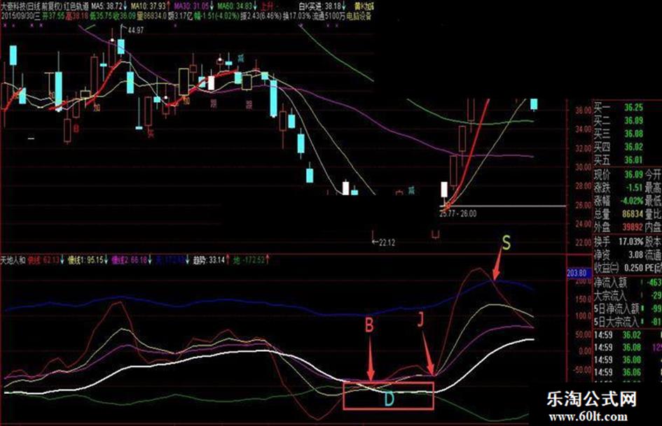 国庆佳节,首先祝论坛的各位朋友们节日快乐, 一直没做什么贡献,再次奉上自用天地人和指标一枚,《庄子》曰:“天地人和,礼之用,和为贵,王之道,斯之美”; 人以地为法则,地以天为法则,天以“道”为法则,“道”则纯任自然,以它自己的本来样子为法则。 具体的的使用方法 B点 即是快线上传趋势线和慢线1,J点是加仓点,快线没有击穿趋势线立刻就拐头向上,S点是卖出点,快线向下击穿“天”,清仓出局; D点的方框表示的是底部区域,此区域“地”向上与趋势线重合,没有了与“天”对应的“地”就是底。