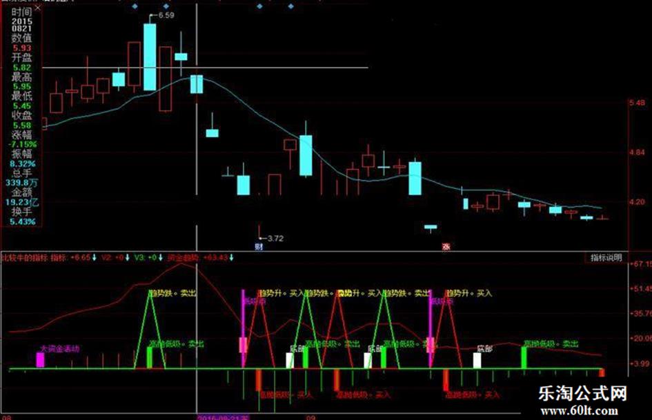DRAWTEXT(VAR1,50,'趋势跌。卖出'),coloryellow;