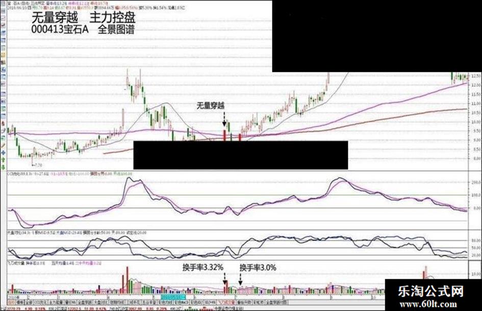 我们把换手率在6%以下全盘穿越的称之为无量全盘穿越,在6%以上的全盘穿越的涨停称之为放量全盘穿越。无量全盘穿越表现的主力控盘的程度,换手率越小,控盘力度越好,因为换手率越小就能轻松穿越筹码密集区说明了,主力持有了大量的筹码;而放量全盘穿越则表明了主力没有控盘或控盘力度较差,主力花费大量资金去建仓,导致了成交量放大,换手率大幅放大,而这种涨停代表了主力拉高建仓,重新布局的迹象,也表明了主力的攻击决心,以大的资金量突破筹码密集区,攻击只是刚刚开始。