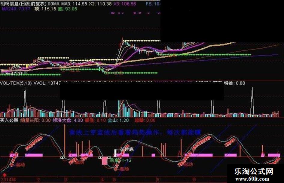 领涨大盘:IF(均五升 AND 均十升 AND 中线趋势升 AND 领涨,4,0),COLORFF66FF,LINETHICK1;
