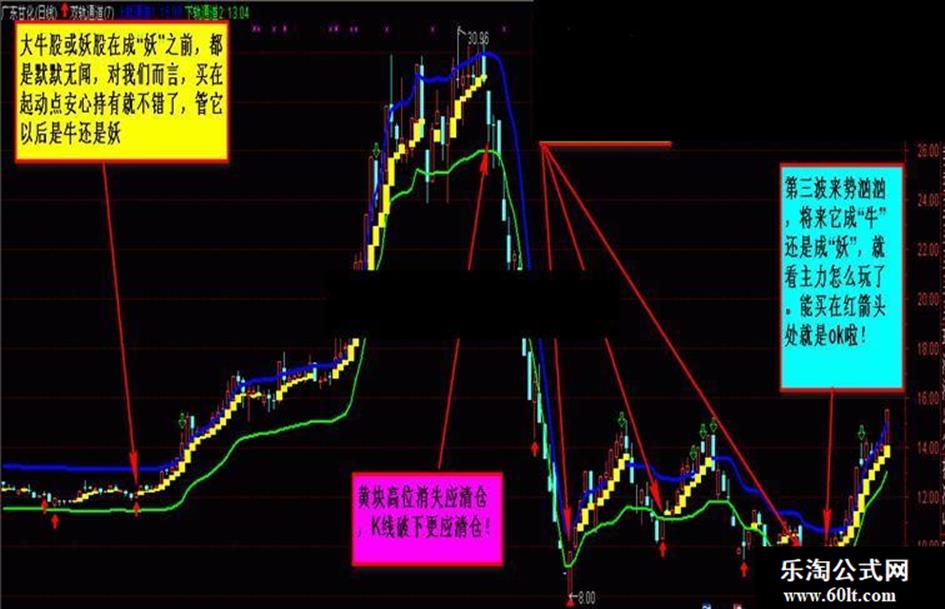 1:黄方块消失是波段卖出点,K线在高位放量不涨,出通道下轨,更应清仓!只做K线在轨道内的股票,这是相对来说最安全的股票!轨道走平,上翘最好!