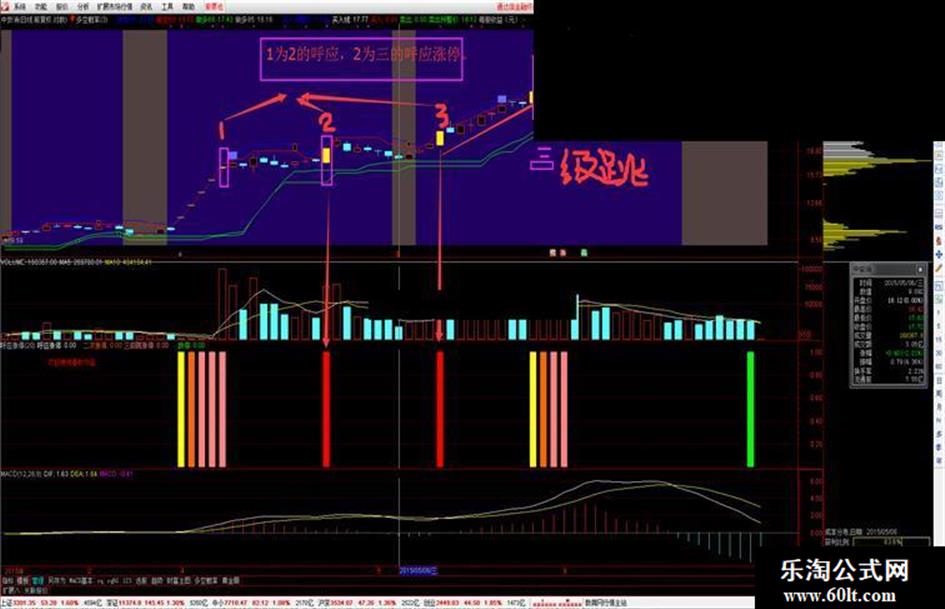 《呼应涨停》为我个人总结原创的方法,现在很多票都是一个形态:横盘突破。横盘突破突破强烈的表现要么大阳线,要么涨停。 指标不加密,乐于分享,感兴趣的朋友请加观注,观注我的宝箱金钻指标,我不以卖指标挣钱(小钱)…… 呼应涨停优选技巧: 1,筹码单峰密集。 2,横盘时时较长。 3,经离过上一次涨停到这次涨停出现过1个“卖出”信号。 4,出现呼应涨停信号之前的有二次元或三级跳涨停。 5,绿柱为跌停,黄柱涨停,淡红柱为二次涨停,粉红柱为三级跳涨停, 红柱为呼应涨停。