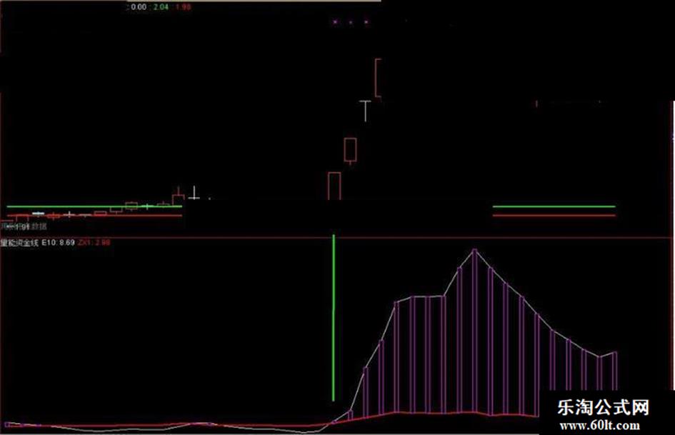 资金线:=AMOUNT/CAPITAL,LINETHICK2; E10:EMA(资金线,10); ZX1:MAX(H,MAX(C,MAX(O,L))),COLORRED,LINETHICK2; STICKLINE(ZX1<E10,ZX1,E10,1,1);