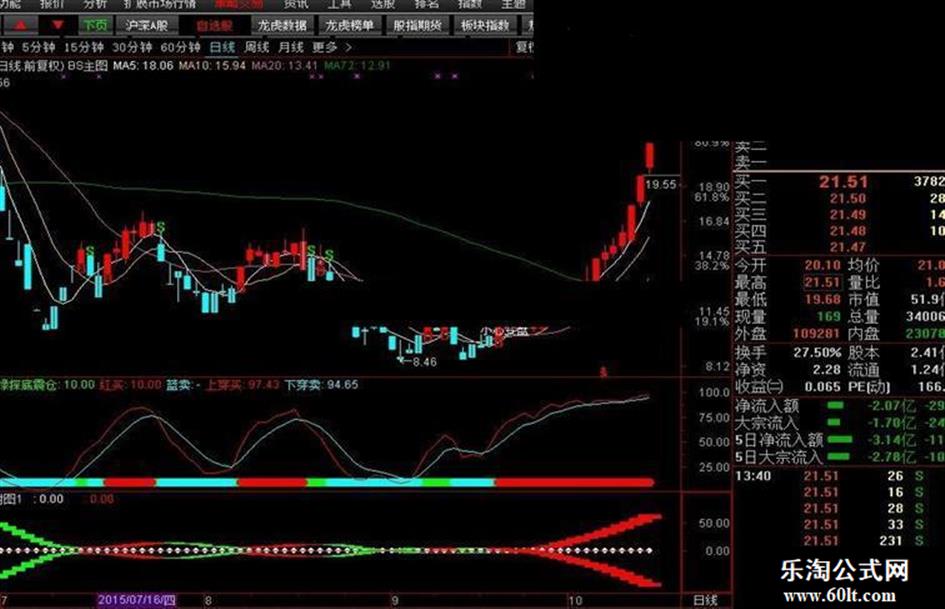 主图立体,简洁,B点买入S点卖出,红色持股绿色持币。配合副图,绿色横条区域很敏感,为观望区,此时的BS点一般都无效,反复探底,洗盘,一般都在绿横条处,必须是红色蓝色区域的BS点才有效。结合指标一般用30分周期反复确认抄底,60分周期做日常买卖决策。做中线用日K线周期。图中有些红K线中有一根细蓝竖线,表示当天收阴,蓝K线有时会有细红线,表示当天收阳。