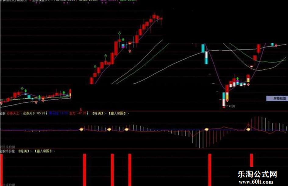 富人帝国的淘金柱指标,包括一个主图和两个副图公式,祝你发财