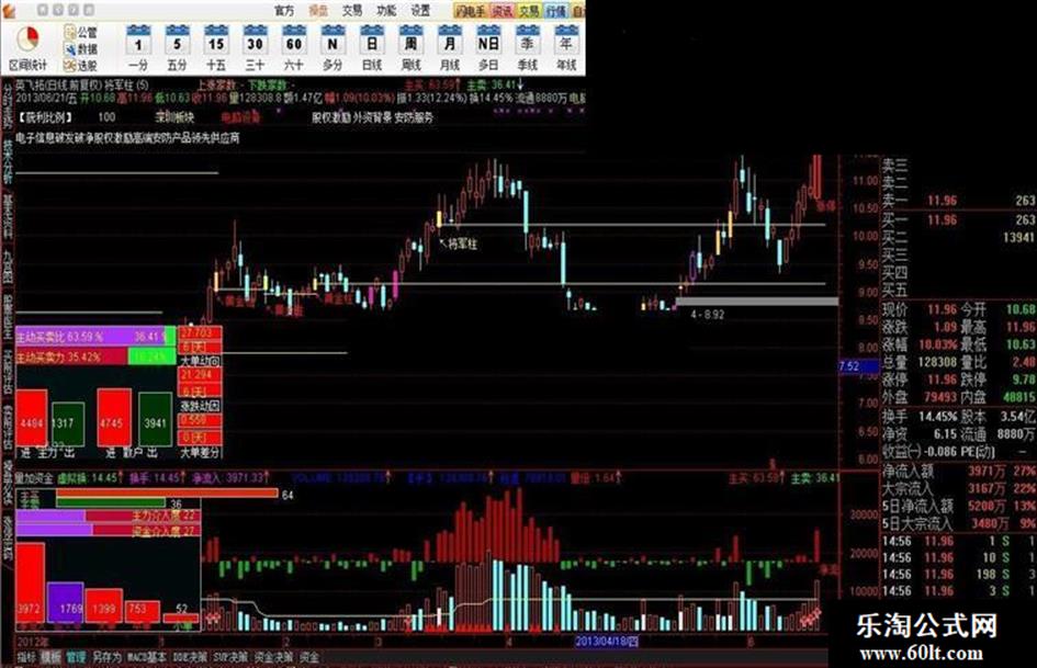 DRAWTEXT_FIX(1,0.22,0.14,1,STRCAT(STRCAT('主力介入度 ',CON2STR(大宗流入比,0)),' ')),COLORYELLOW;