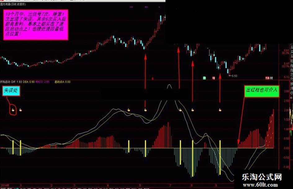 波段启动点是在改变MACD的参数之后而成的,优化原MACD的参数是因为原参数出信号过多,有很多假信号易造成失误,优化后去掉了很多无用的信号,虽然少,但能让你买在大跌或洗盘之后波段的启动点上,接近波段最低点的位置!