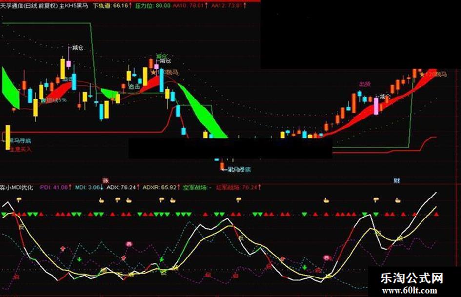 红军战场:IF(MDI<REF(MDI,1) AND PDI>REF(PDI,1),ADX,DRAWNULL),LINETHICK2,COLORRED;
