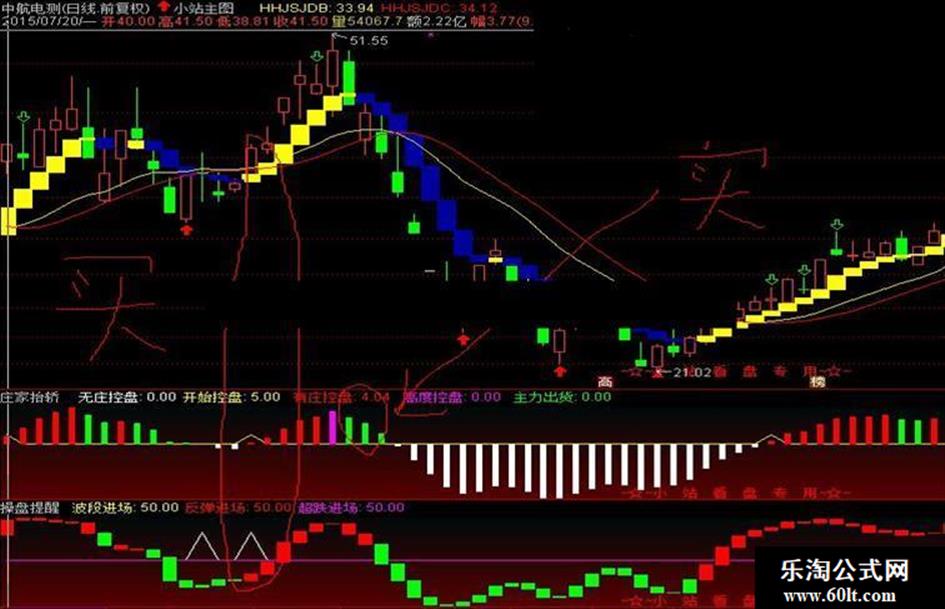 选股思路:主图蓝色之后的第一个黄色+庄家抬轿出现黄色三角+操盘提醒出现白色三角+操盘提醒颜色为红色