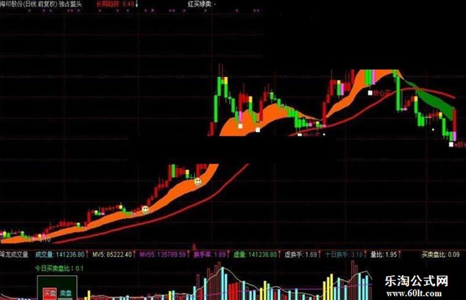 多空趋势彩带:DRAWBAND(SMA(C,6.5,1),RGB(255,97,0),SMA(C,13.5,1),RGB(0,128,0));