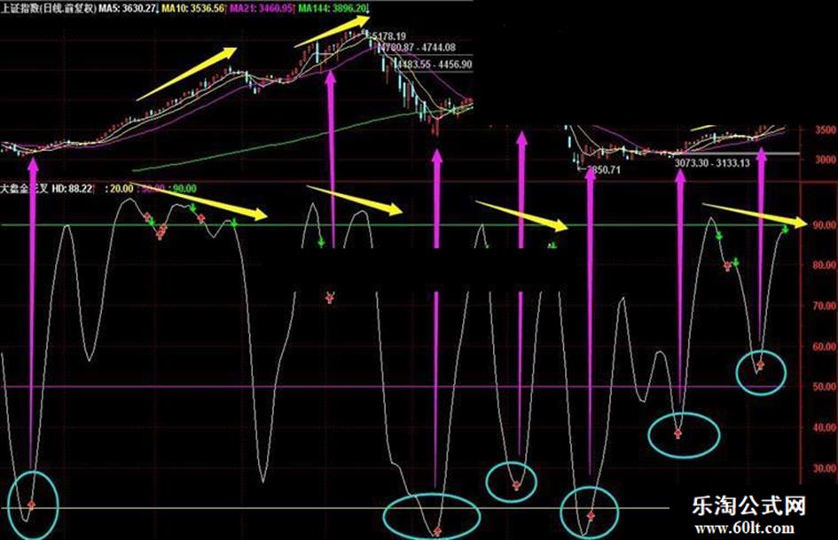 最近在复盘大盘的时候,无意中发现一现象,变成一指标后,发现对大盘还是挺好用,尤其对大盘无从下手的初学者们,更加试用!很直观,红色箭头大盘进入好趋势,绿箭头或者白线下穿90大盘进入调整区,该谨慎! 还有很多的玩法,背离啊什么的,自己可以优化!