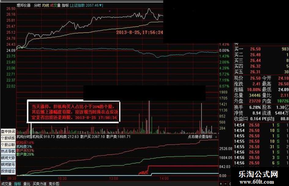 2. 如果机构买入占比超过50%,而且发现有表示强势资金流入的紫线竖线和黄色竖线,此股为机构介入的强势股,当天一般会涨停,出现此类信号提示时就应该马上买入。