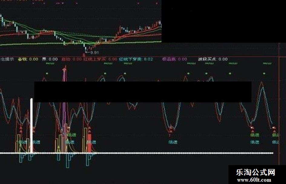 VAR2:=REF(LOW,1); VAR3:=SMA(ABS(LOW-VAR2),13,1)/SMA(MAX(LOW-VAR2,0),13,1)*100; VAR4:=EMA(IF(CLOSE*1.2,VAR3*13,VAR3/13),13); VAR5:=LLV(LOW,34); VAR6:=HHV(VAR4,34); VAR7:=IF(LLV(LOW,55),1,0); VAR8:=EMA(IF(LOW<=VAR5,(VAR4+VAR6*2)/2,0),3)/618*VAR7; VAR9:=EMA(CLOSE,5); VAR10:=(CLOSE-MA(CLOSE,34))/MA(CLOSE,34)*(-10); VAR11:=EMA(IF(LOW<=VAR5,(VAR4+VAR6*2)/2,0),3)/618*VAR7*(-1); VAR12:=EMA(CLOSE,5)*(-1); STICKLINE(VAR8>REF(VAR8,1),0,VAR8,6,1),COLOR10FFFF,LINETHICK3; 备钱:IF(VAR8>REF(VAR8,1),0,VAR8),COLOR0FFFFF; STICKLINE(VAR11>REF(VAR11,1),0,VAR11,6,1),COLORFFF810; 界:0,COLORFFFFFF,LINETHICK1; XL1:=MA(LOW,2)*0.96; XL2:=MA(LOW,26)*0.85; XL3:=REF(XL1,1)<XL2 AND REF(XL1,1)<XL1 AND REF(XL1,1)<REF(XL1,2); STICKLINE(XL3,0,VAR8*3,8,0),COLORRED; 启动:IF(XL3,0,VAR8*3),COLORRED; VA:=(2*C+H+L)/4; VB:=LLV(L,5); VC:=HHV(H,5); 红线上穿买:EMA((VA-VB)/(VC-VB)*27,5),COLORRED; 红线下穿卖:EMA(红线上穿买,3),COLORFFFF00; 散户:= EMA(((2*CLOSE+HIGH+LOW)/4-LLV(LOW,5))/(HHV(HIGH,4)-LLV(LOW,5))*100,4); 庄家:= EMA(0.667*REF(散户,1)+0.333*散户,2); DRAWTEXT(CROSS(散户,庄家) AND 散户<30,5,'低进'),COLOR00FF00; DRAWTEXT(CROSS(散户,庄家) AND 散户<30,7,'●'),COLORFFFFFF; DRAWTEXT(CROSS(庄家,散户) AND 散户>70,25,'高出'),COLOR00FF00; DRAWTEXT(CROSS(庄家,散户) AND 散户>70,22,'●'),COLOR00FF00; 极品底:IF((MA(C,5)-C)/C>0.04 AND (MA(C,10)-MA(C,5))/MA(C,5)>0.04,23,0),LINETHICK2,COLORFF00FF; DRAWICON(极品底=23,23,1),L;
