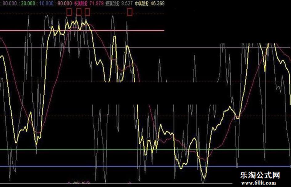 {见顶:(长期线>85 OR REF(长期线,1)>85)AND(CROSS(中期线,短期线)OR CROSS(REF(中期线,1),REF(短期线,1)))AND CROSS(长期线,短期线);