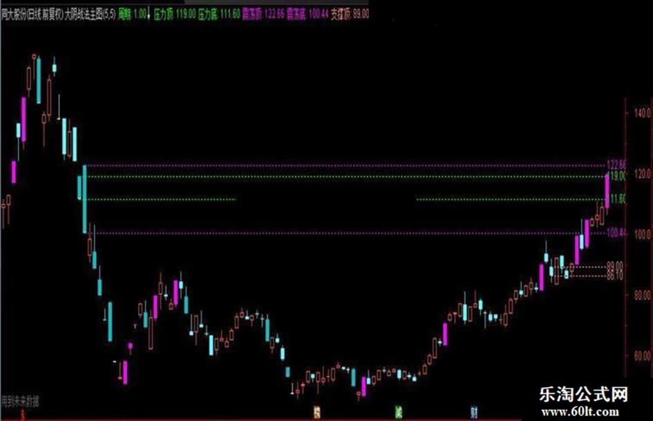 说明:由于是转帖,不加太多此指标的使用说明,因为此指标有划线,所以包含未来函数,适合判断大方向的压力与支撑。慢慢揣摩,必有收获……。