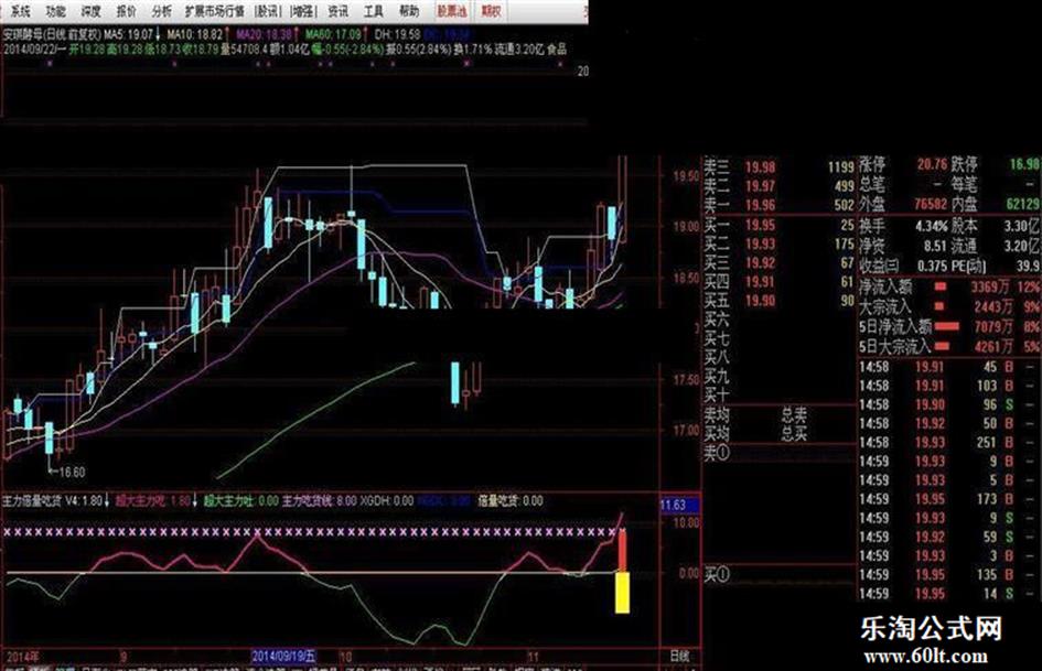 超大主力吃:=IF(V4>=0,V4,0),COLOR7F00FF,LINETHICK2;