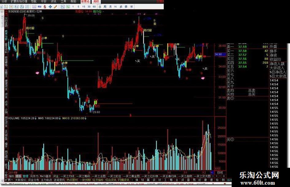 DRAWTEXT(卖出条件 AND D2>=36 AND D2<39,HIGH*1.13,'↙赚38%'),COLORRED;