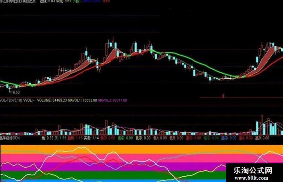 DRAWBAND(0,RGB(0,139,255),0.5,RGB(0,139,255)),COLORFF8B00; DRAWBAND(0.5,RGB(0,120,0),1,RGB(0,120,0)),COLOR007800; DRAWBAND(1,RGB(187,0,187),1.5,RGB(187,0,187)),COLORBB00BB; DRAWBAND(1.5,RGB(255,58,133),2,RGB(255,58,133)),COLOR853AFF; DRAWBAND(2,RGB(255,152,0),2.5,RGB(255,152,0)),COLOR0098FF; DRAWTEXT(ISLASTBAR,0.25,'███'),COLORFF8B00; DRAWTEXT(ISLASTBAR,0.25,'冰冻'),COLORFFFFCC; DRAWTEXT(ISLASTBAR,0.75,'███'),COLOR007800; DRAWTEXT(ISLASTBAR,0.75,'冷门'),COLORWHITE; DRAWTEXT(ISLASTBAR,1.25,'███'),COLORBB00BB; DRAWTEXT(ISLASTBAR,1.25,'活跃'),COLORFFFFCC; DRAWTEXT(ISLASTBAR,1.75,'███'),COLOR853AFF; DRAWTEXT(ISLASTBAR,1.75,'热门'),COLORWHITE; DRAWTEXT(ISLASTBAR,2.25,'███'),COLOR0098FF; DRAWTEXT(ISLASTBAR,2.25,'高温'),COLORWHITE; {计算数据} R:=PERIOD; S:=FROMOPEN;VA1:=EMA(CAPITAL/IF(R=0,SUM(VOL,S),VOL)/CLOSE,10)/CLOSE; 地:IF(VA1>=2.5,2.5,VA1),COLORYELLOW,LINETHICK2; 天: POW(ATAN(EMA(CAPITAL/IF(R=0,SUM(VOL,S),VOL)/CLOSE,10)),2),COLORB5CA43,LINETHICK2; 趋势: EMA(WINNER(CLOSE)*100,10)/50,LINETHICK2,COLOR0015FF; 买卖: EMA((-3)*(HHV(HIGH,30)-CLOSE)/(HHV(HIGH,30)-LLV(LOW,30))+2.7,9),COLORWHITE,LINETHICK2; {低位信号} 低①:买卖<0,COLORRED,NODRAW; STICKLINE(低①,0,-0.1,3,0), COLORRED; 低②:买卖<0.1 AND 买卖>0 AND 买卖>=ref(买卖,1),COLORGREEN,NODRAW; STICKLINE(低②,0,-0.1,2.5,0), COLORGREEN; 低③:买卖<0.25 AND 买卖>0.1 AND 买卖>=ref(买卖,1),COLORYELLOW,NODRAW; STICKLINE(低③,0,-0.1,2,0), COLORYELLOW; 低A:买卖<0 AND 买卖>=ref(买卖,1),COLOR0099FF,NODRAW; STICKLINE(低A,0.1,-0.1,3,0), COLOR0099FF; 低B:买卖<ref(HHV(买卖,5),4) AND 买卖>=ref(买卖,1) AND 买卖<0.8 AND 趋势>=ref(趋势,1) AND ref(EXIST(买卖<=ref(买卖,1),2),1) AND ref(EXIST(买卖<=0,10),8),COLOR0099FF,NODRAW; STICKLINE(低B,0.3,0,3,0), COLOR0099FF; {高位信号} 高①:买卖>2.5 AND 买卖>ref(买卖,1),COLORRED,NODRAW; STICKLINE(高①,2.6,2.4,3,0),COLORRED; 高②:天>=1.9 AND 买卖>=2.2 AND CROSS(ref(HHV(买卖,3),3),天),COLOR007800,NODRAW; STICKLINE(高②,2.6,2.4,2.5,0),COLOR007800; 高③:天<1.77 AND 买卖>=2.2 AND CROSS(ref(HHV(买卖,7),6),天),COLORFF8B00,NODRAW; STICKLINE(高③,2.6,2.4,2,0),COLORFF8B00; 高A:买卖>2.45 AND 买卖<2.5 AND 买卖<=ref(买卖,1), COLORRED,NODRAW; STICKLINE(高A,2.5,2.4,3,0), COLORRED; 高B:买卖>ref(LLV(买卖,5),4) AND 买卖<=ref(买卖,1) AND 买卖>1.5 AND 趋势<=ref(趋势,1) AND ref(EXIST(买卖>=ref(买卖,1),2),1) AND ref(EXIST(买卖>=2.48,10),8), COLOR0099FF,NODRAW; STICKLINE(高B,2.7,2.4,3,0), COLOR0099FF;