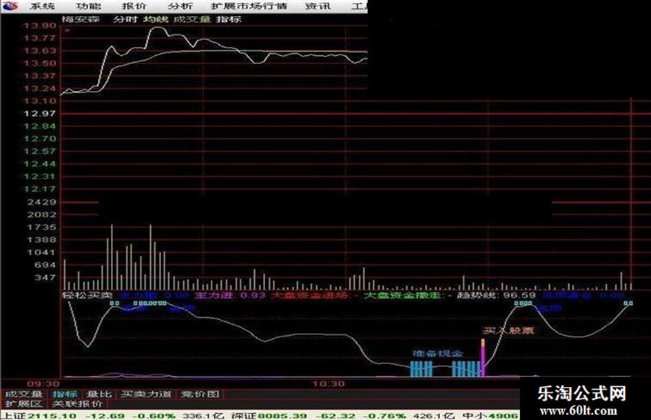 在股市多年,这是第一次发帖,望抛砖引玉石!在论坛看了诸多高手帖子指标,综合各位的指标源码和思路也发个高抛低吸指标“轻松买卖”;之前很多类似指标,要么成功率不高,要么有未来函数,觉得不很理想,利用轻松买卖指标在分时图上高抛低吸,成功率很高!使用说明:发出见顶清仓信号可以卖掉一部分仓位,等候发出买入股票信号后再买入刚才卖出信号,如此反复操作,可以大幅降低持仓成本,我们曾经用中国石油这只股票做过推演,如果2007年上市第一天最高价买入,照此高抛低吸操作,结果不一定是亏损的。