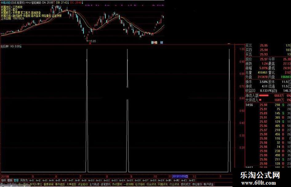 本指标基本只出现在市场大跌中,老手都能逃顶,但老手容易抄底时间不对导致抄底在半山腰,大跌过程中何时是机会,频繁出现的诱多如何排除就看这个指标。 出现当然多是大涨,只要能减持到尾盘信号不消失,杀入后第二天要么给你高走的机会,要么就是连续几日的强力反弹,极少出现没有高位让你出货的,被套几率小,如果被套点数也小。看看周四出现的中航动控周五高位9个点