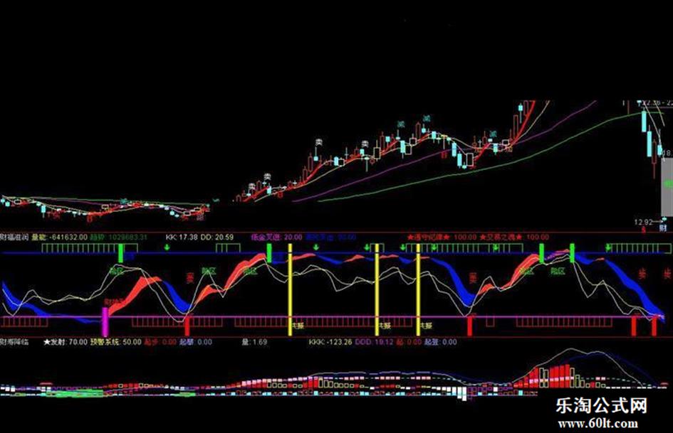 这指标主要是中心在量能(黄色)和趋势(深绿色)柱体。这两者直接可以显示出个股的走势,从而把握机会!只要量能柱一柱擎天,那么就是最佳的逢低布局机会!若再出现低位共振,红色财神到和安买信号,那证明个股已经在地位回调有一定时间,并且主力开始慢慢的介入,这就是砸锅卖铁买进去,等待着数钱!