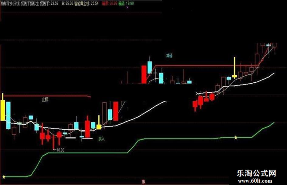 MMS:=MA(SMA((L+H+2*C)/4-REF((L+H+2*C)/4,1),5,1)/SMA(ABS((L+H+2*C)/4-REF ((L+H+2*C)/4,1)),5,1)*100,1)+50; G1:=IF(-MMS>95,0,20); UOO:=(-(((CLOSE-LLV(CLOSE,7))/(HHV(CLOSE,7)-LLV(CLOSE,7))*100=100)>0 AND G1)+1); {明日均线:=REF(C,2)*2-REF(C,5),LINETHICK0,COLOR550055 ; 后日均线:=REF(C,1)*2-REF(C,4),LINETHICK0,COLOR008800; 大后天均线:=C*2-REF(C,3),LINETHICK0,COLOR008888;} KS:=(((CLOSE - EMA(CLOSE,13)) / EMA(CLOSE,13)) * (0 - 100)); KS1:=IF(BARSCOUNT(C)=1,C/10000,(1-C/SMA(C,13,1))*100); 趋势线:=EMA(((KS / 10) + EMA(CLOSE,10)),3); AA:= - 100 * (趋势线 - CLOSE) / 趋势线; AC:=(EMA(AA,5) ); SSL:=EMA(CLOSE,3); MMV:=EMA(((SLOPE(CLOSE,22) * 20) + CLOSE),55); MM:=MMV; {STICKLINE(((SSL > MM) ),SSL,MM,0.1,0),COLORRED;} SA:=(MM * 0.985); SS:=(MA(CLOSE,5)); DD:=(MA(CLOSE,13)); GG:=(MA(CLOSE,21)); 捞钱手:IF(((SSL > MM)),MM,SA),LINETHICK2,COLORWHITE; VAR2Y:=(((CLOSE - REF(CLOSE,1)) / REF(CLOSE,1)) * 100); VAR3Y:=(((CLOSE - REF(OPEN,29)) / REF(OPEN,29)) * 100); VAR4Y:=REF(CLOSE,1); VAR5Y:=((SMA(MAX((CLOSE - VAR4Y),0),6,1) / SMA(ABS((CLOSE - VAR4Y)),6,1)) * 100); VAR6Y:=((SMA(MAX((CLOSE - VAR4Y),0),12,1) / SMA(ABS((CLOSE - VAR4Y)),12,1)) * 100); VAR7Y:=((SMA(MAX((CLOSE - VAR4Y),0),24,1) / SMA(ABS((CLOSE - VAR4Y)),24,1)) * 100); VAR8Y:=(((CLOSE - LLV(LOW,45)) / (HHV(HIGH,45) - LLV(LOW,45))) * 100); VAR9Y:=SMA(VAR8Y,3,1); VARAY:=SMA(VAR9Y,3,1); VARBY:=((3 * VAR9Y) - (2 * VARAY)); VARCY:=(CROSS(VAR5Y,10) AND (VAR3Y < (0 - (28 * 20)))); VARDY:=((100 - CROSS(76,VAR5Y)) AND (VAR3Y > (5 * 20))); DRAWICON(((CROSS(76,VAR5Y) AND (VAR3Y > 5)) ),(HIGH * 1.01),5),COLORFFFFFF; VAREY:=((((CROSS(VAR9Y,VARAY) AND (VARAY < 10)) AND (VAR3Y < (0 - 30))) AND (VAR2Y > 3)) * 30); VARFY:= - ((((VARAY < 11) AND (VAR5Y < 15)) AND (VAR3Y < (0 - 26))) * 10); DRAWICON((CROSS(VARFY,(0 - 9))),(LOW * 0.998),4); 能量线:=DMA(((CLOSE + OPEN) / 2),(VOL / (SMA(VOL,4,1) * 4))); 上开:=O; 上收:=C; 上高:=H; 上低:=L; JJ:=(上开+上高+上低)/3; A:=EMA(JJ,4); B:REF(A,1),POINTDOT,COLORYELLOW; 智能黄金线:A,COLORYELLOW,LINETHICK1; VA1:=EMA(上收,8); VA2:=EMA(上收,20); DRAWTEXT(CROSS(VA2,VA1),VA1*1.10,'止损'),COLORYELLOW; DRAWTEXT(CROSS(VA1,VA2)AND(C>=O)AND 智能黄金线>REF(智能黄金线,1),VA1*0.96,'买入'),COLOR00FF00; 选手A:=MA(上收,3); 箱顶A:=MA(REF(HHV(上收,6),1),3); 箱底A:=MA(REF(LLV(上收,3),1),3); T1:=MA(上收,20)>=REF(MA(上收,20),1); T2:=CROSS(选手A,箱底A) AND 箱顶A/箱底A>100/100 AND T1; T3:=CROSS(箱顶A,选手A) AND 箱顶A/箱底A>100/100; 选手:=MA(上收,2); 箱顶:MA(REF(HHV(上收,30),1),2),COLOR0000FF,LINETHICK2; 箱底:MA(REF(LLV(上收,30),1),2),COLOR00FF00,LINETHICK2; T4:=CROSS(选手,箱底) AND 箱顶/箱底>110/100; T5:=CROSS(箱顶,选手) AND 箱顶/箱底>110/100; VAR1:=(上收-LLV(上低,27))/(HHV(上高,27)-LLV(上低,27))*100; VAR2:=SMA(VAR1,3,1); VAR3:=SMA(VAR2,3,1); VAR4:=SMA(VAR3,3,1); DRAWTEXT(CROSS(VAR3,VAR4)AND(C>=O)AND VAR3<40 AND UOO>0,箱底,'★'),COLORF00FF0; DRAWTEXT(CROSS(VAR4,VAR3) AND VAR4>75 ,箱顶*1.03,'减磅'),COLORF0F000; VAR111:=CLOSE>REF(CLOSE,1) AND CLOSE>REF(CLOSE,2); VARD:=CLOSE<REF(CLOSE,1)AND CLOSE<REF(CLOSE,2); VARE :=REF(VARD,1) AND CLOSE>=REF(CLOSE,1) AND CLOSE<=REF(CLOSE,2); VARF :=REF(VARE,1) AND CLOSE<=REF(CLOSE,1) AND CLOSE>=REF(CLOSE,2); VAR10 :=REF(VARF,1) AND CLOSE>=REF(CLOSE,1) AND CLOSE<=REF(CLOSE,2); VAR11:=REF(VAR10,1) AND CLOSE<=REF(CLOSE,1) AND CLOSE>=REF(CLOSE,2); VAR12:=REF(VAR11,1) AND CLOSE>=REF(CLOSE,1) AND CLOSE<=REF(CLOSE,2); VAR13:=REF(VAR12,1) AND CLOSE<=REF(CLOSE,1) AND CLOSE>=REF(CLOSE,2); VAR14:=REF(VAR13,1) AND CLOSE>=REF(CLOSE,1) AND CLOSE<=REF(CLOSE,2); VAR15:=REF(VAR14,1) AND CLOSE<=REF(CLOSE,1) AND CLOSE>=REF(CLOSE,2); VAR16:=REF(VAR15,1) AND CLOSE>=REF(CLOSE,1) AND CLOSE<=REF(CLOSE,2); VAR17:=REF(VAR16,1) AND CLOSE<=REF(CLOSE,1) AND CLOSE>=REF(CLOSE,2); VAR18:=REF(VAR17,1) AND CLOSE>=REF(CLOSE,1) AND CLOSE<=REF(CLOSE,2); VAR19:=REF(VARD OR VARE OR VARF OR VAR10 OR VAR11 OR VAR12 OR VAR13 OR VAR14 OR VAR15 OR VAR16 OR VAR17 OR VAR18,1) AND VAR1; 趋势线1:=FORCAST(CLOSE,7); FK:=100*(C-REF(C,1))/REF(C,1); PK1:=IF(C<REF(O,1) AND FK<0,1,0); PK2:=IF(C<REF(O,2) AND FK<0,1,0); STICKLINE((PK1=0 AND REF(PK1,1)=1 AND PK2=0 AND REF(PK2,1)=1)AND(趋势线1>REF(趋势线1,1)OR 智能黄金线>REF(智能黄金线,1)),OPEN,CLOSE,3,0),COLORRED; STICKLINE((PK1=0 AND REF(PK1,1)=1 AND PK2=0 AND REF(PK2,1)=1)AND(趋势线1>REF(趋势线1,1)OR 智能黄金线>REF(智能黄金线,1)),H,L,0.5,0),COLORRED; PK3:=(((CLOSE / OPEN) > 1.04) AND (CLOSE <(SMA(HIGH,21,2) * 1.05))) AND ((CLOSE - REF(CLOSE,1)) > 0); STICKLINE(PK3 AND(趋势线1>REF(趋势线1,1)OR 智能黄金线>REF(智能黄金线,1)),CLOSE,OPEN,3,0),COLORRED; STICKLINE(PK3 AND(趋势线1>REF(趋势线1,1)OR 智能黄金线>REF(智能黄金线,1)),H,L,0.5,0),COLORRED; STICKLINE(VAR19 AND(趋势线>REF(趋势线1,1)OR 智能黄金线>REF(智能黄金线,1)),CLOSE,OPEN,3,0),COLORRED; STICKLINE(VAR19 AND(趋势线>REF(趋势线1,1)OR 智能黄金线>REF(智能黄金线,1)),H,L,0.5,0),COLORRED; 买进价:=((C-REF(MA(C,6),1))/6+MA(C,6))*1.004; 买进条件:=CROSS(C,买进价) AND 买进价>REF(买进价,1); STICKLINE(买进条件 AND 捞钱手>智能黄金线 AND 智能黄金线>REF(智能黄金线,1),L,L*0.998,7,0),COLORWHITE; 买线:=EMA(C,2); 卖线:=EMA(SLOPE(C,21)*20+C,42); DRAWTEXT(CROSS(买线,卖线)AND 箱顶>=REF(箱顶,1),箱底,'★'),COLOR00FFFF; STICKLINE(CROSS(买线,卖线),OPEN,CLOSE,3,0),COLOR00FFFF; STICKLINE(CROSS(买线,卖线),H,L,0.5,0),COLOR00FFFF;