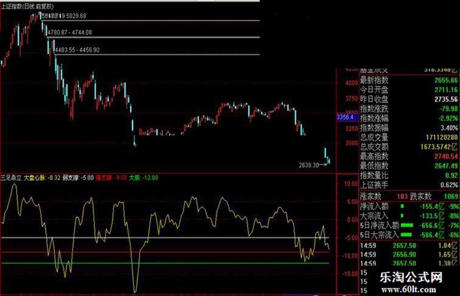 最进大盘杀跌很多股友应该都在猜测大盘到底会跌到什么点位是吧?今天和大家分享《判断大盘下跌位子三足鼎立》指标,有了这个指标我们就可以清楚的看到大盘现在所处的位子,本指标无未来放心使用,这个指标可以应用到多周期。根据大盘以前拐点反弹位子我们就可以大概研判大盘在什么点位反弹!下图是大盘日线,60分钟,15分钟图
