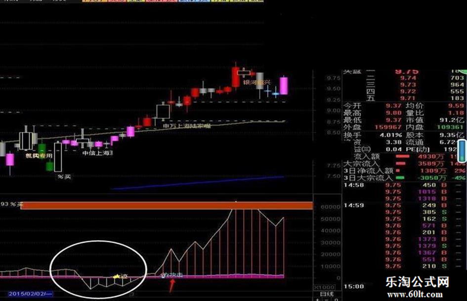 DRAWTEXT_FIX(1,0.000,0.00,0,STRCAT(STRCAT('【资金流量比】',CON2STR(资金流量比,2)),'%买')),COLORYELLOW;