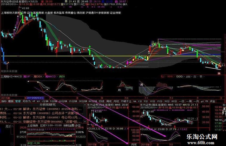 经过一周的研究,终于解决了不同大小指标线之间的叠加。现将经典指标kdj和macd合并到一个副图中,左侧依次为月kdj 周kdj 日kjd .