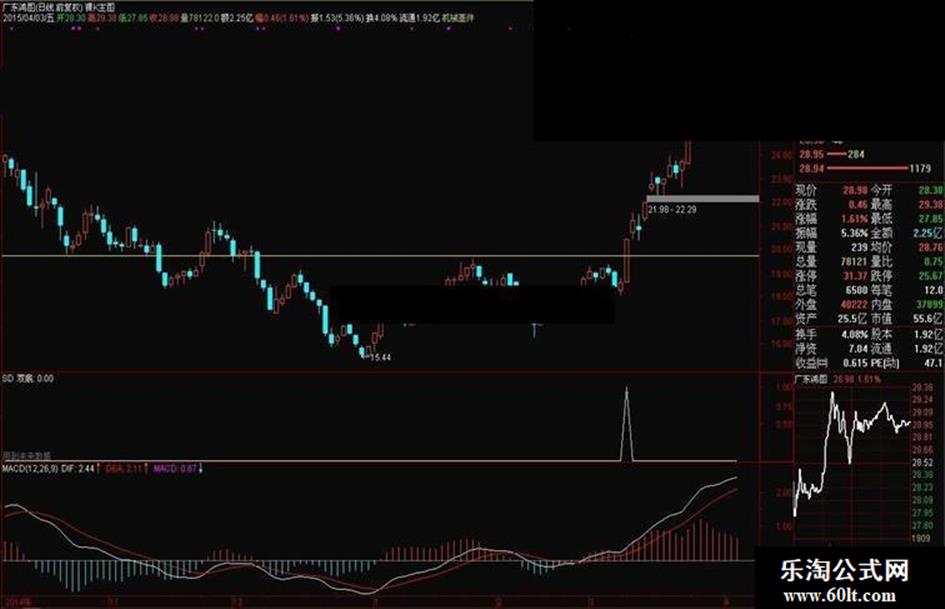 双底:CROSS(C,前高) AND REF(前高,T+2)>前高 AND LLV(L,T)>REF(LLV(L,T1),T+2) AND REF(HHV(H,T-1),1)<前高 AND (HHV(H,100)-C)/HHV(H,100)*100>10;