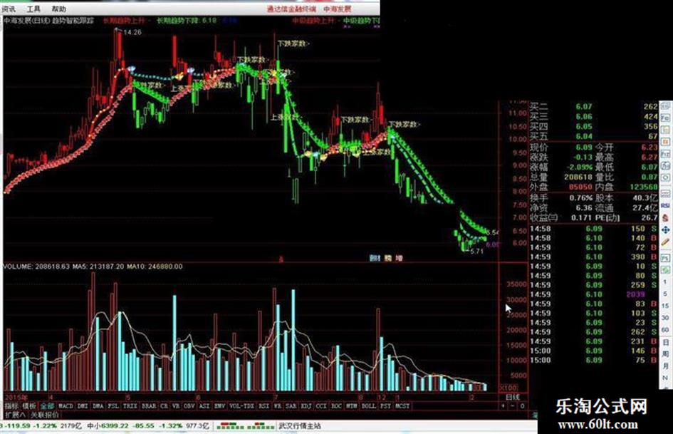 中级趋势下降:IF(LS,趋势线,DRAWNULL),LINETHICK2,COLORGREEN;